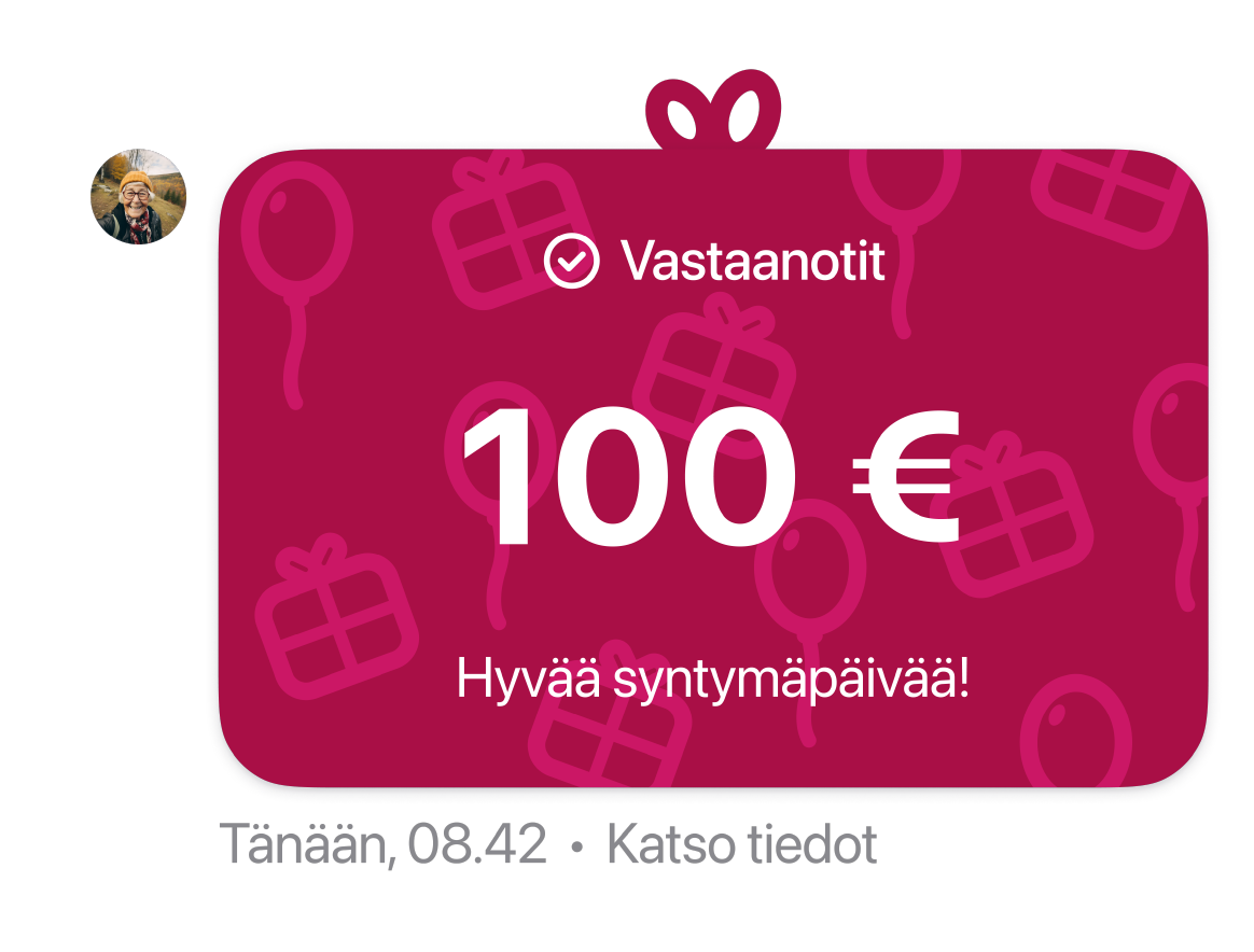 MobilePaylla voit lähettää personoituja rahalahjoja läheisillesi helposti. Voit lähettää rahalahjan joko heti tai ajastaa sen, jotta lahjan saaja vastaanottaa lahjan juuri sopivana hetkenä.